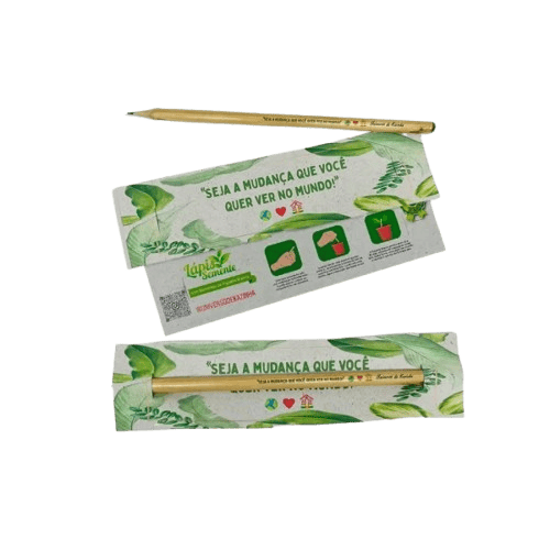Lápis Semente acompanhado de embalagem em papel reciclado, totalmente livre de plástico, ideal para brindes ecológicos. Recebe personalização tanto na tag quanto no corpo do lápis, valorizando sua marca com criatividade. Disponível com sementes de hortaliças, flores, árvores e temperos, que podem ser plantadas após o uso. Uma opção sustentável, educativa e marcante para eventos, campanhas e ações promocionais com foco ambiental. Medidas: Tag 18×5 cm com instrução de plantio no verso. Medida do Lápis: 17×0,6cm